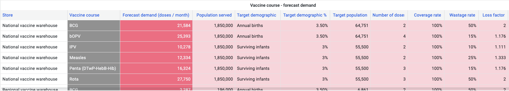 Create a national immunization schedule and then a vaccine course. Include the item to forecast in the course and create at least one dose for that course. (see Programs > Immunizations)