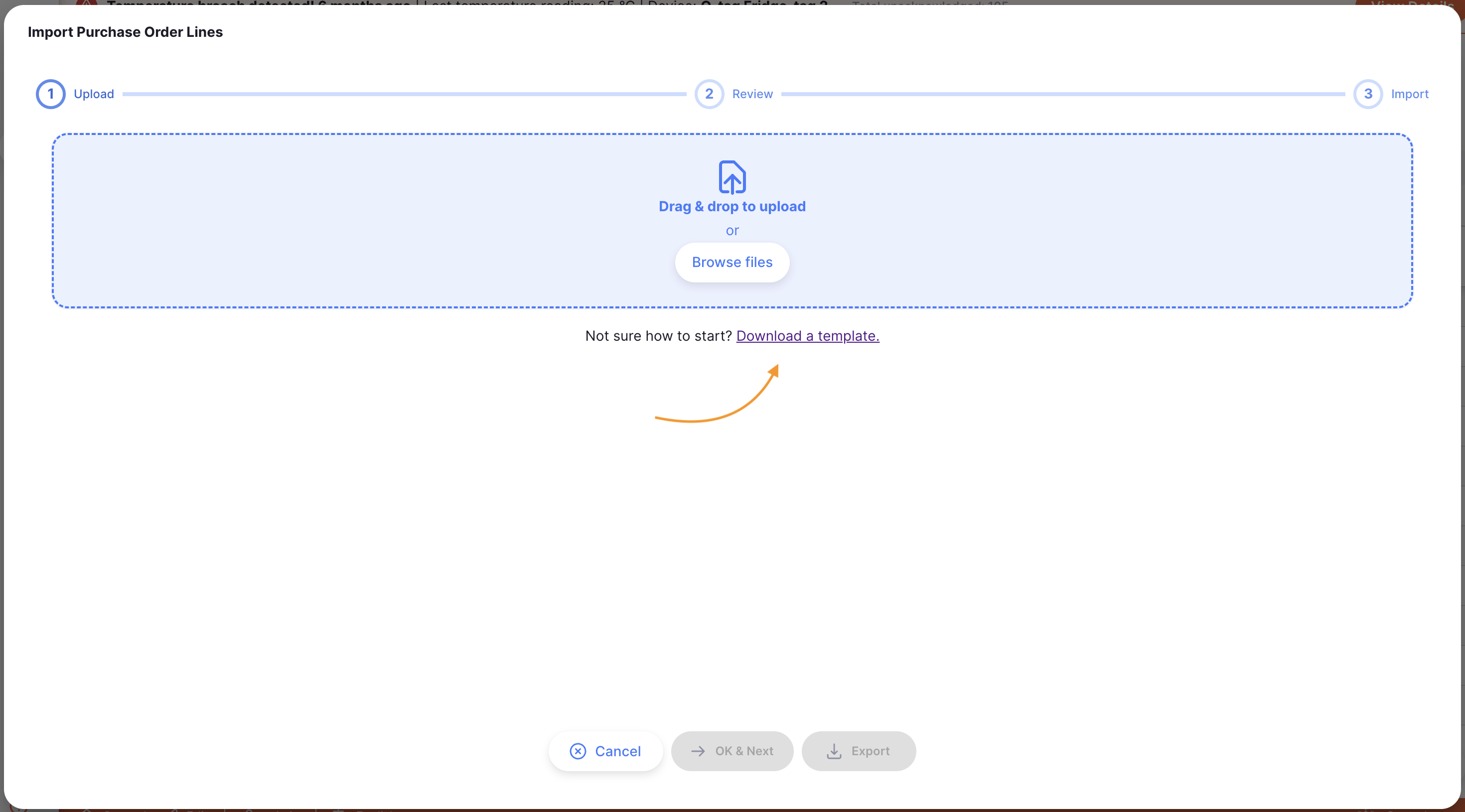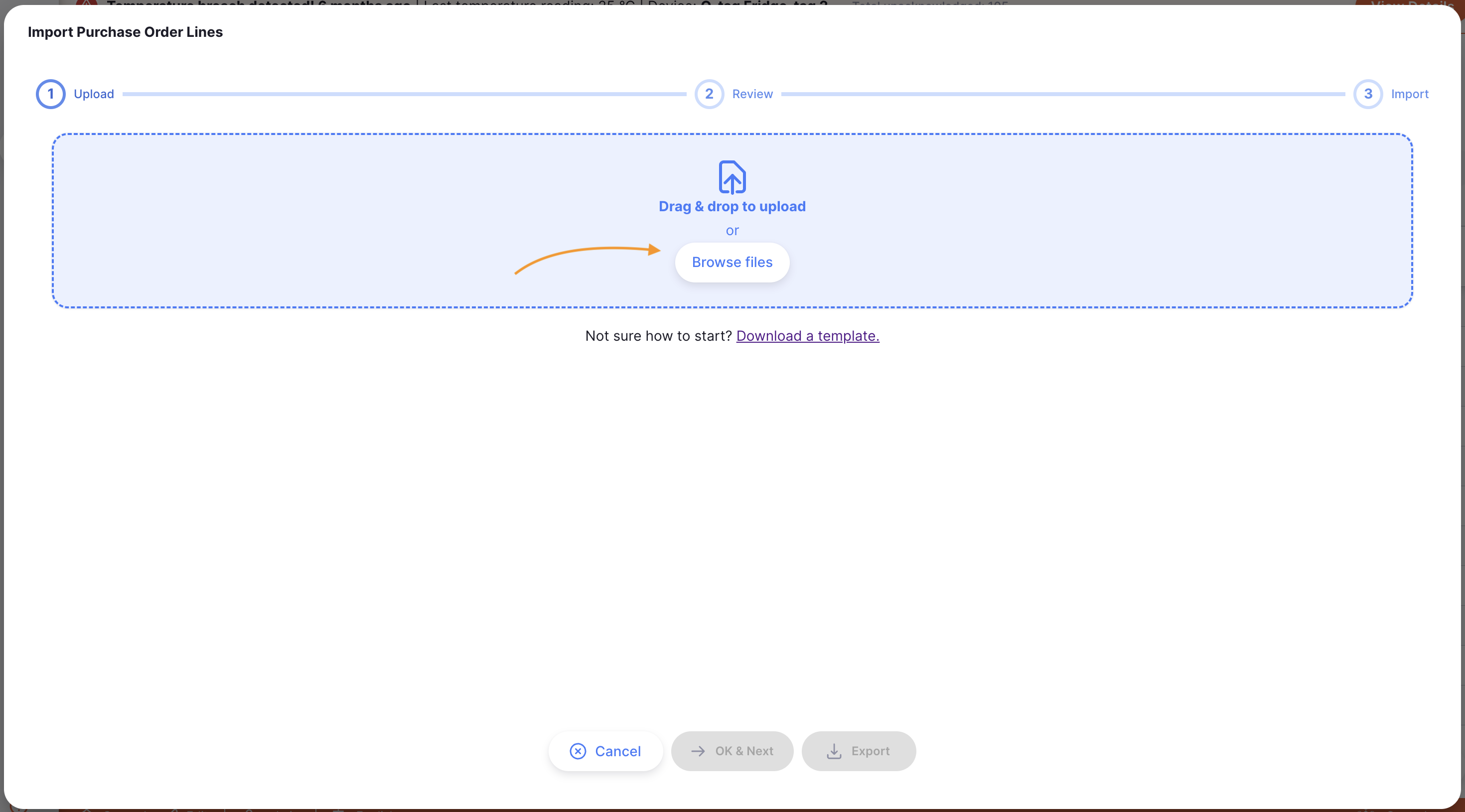 When you are ready, drag and drop the csv file into the modal or click on the Browse files button to select the file from your computer.