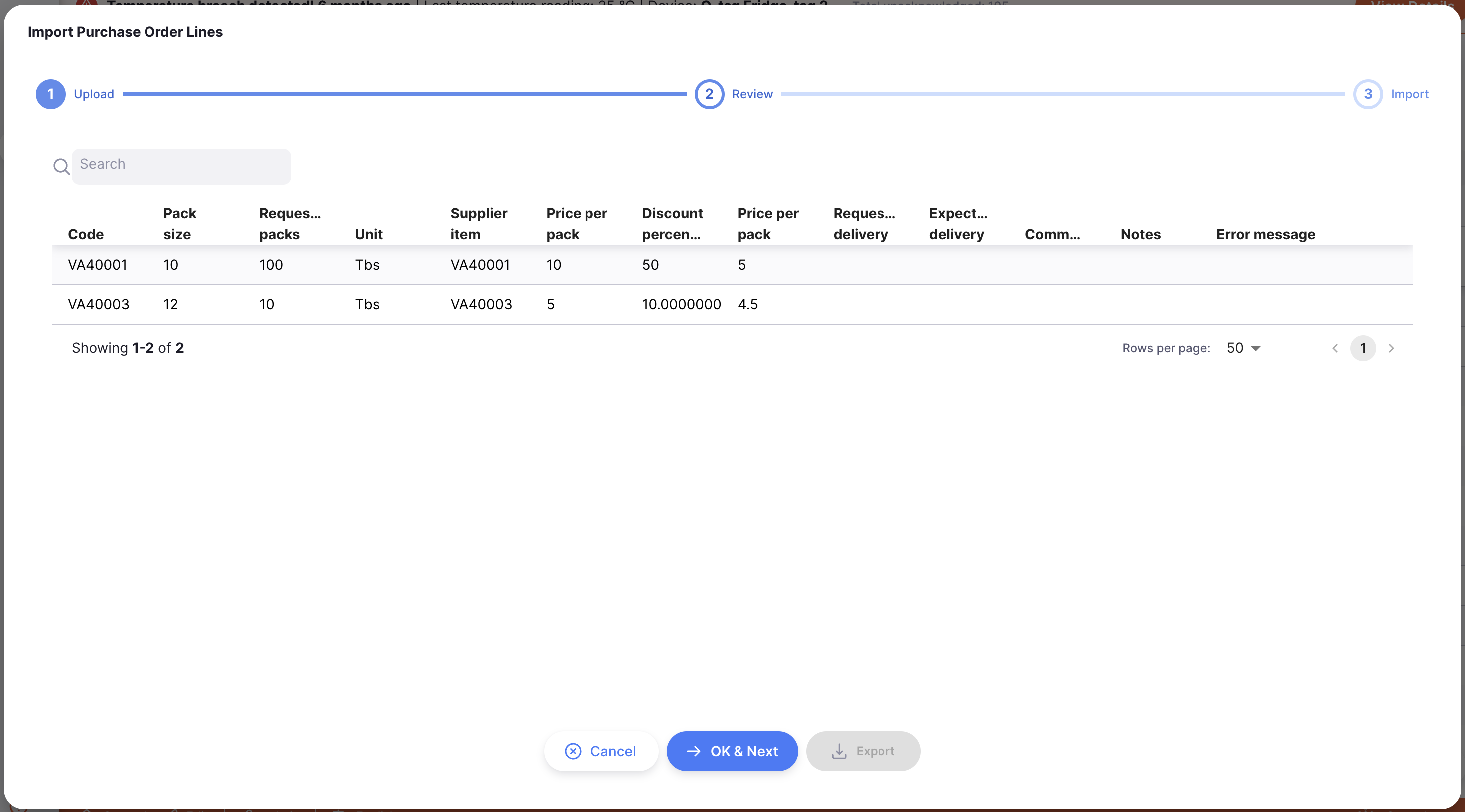 The imported rows will have zero for the number of packs value, and are therefore shown in a blue font with no requested amount or pricing. You can follow the steps for editing these lines, as detailed above.